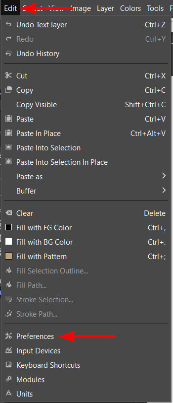 To start, open GIMP and the preferences panel by going to Edit > Preferences.