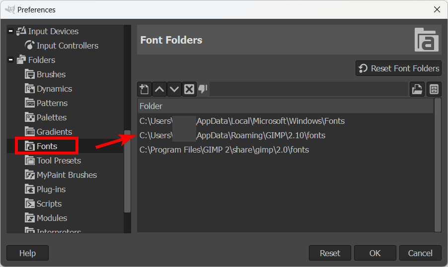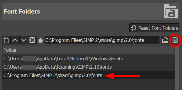 You will then see a list of the folders that GIMP is accessing to find font files. You can click on a folder and check the icon above to see whether the folder still exists. If the folder was deleted from your device, this will cause an error, and you will need to use a different folder.