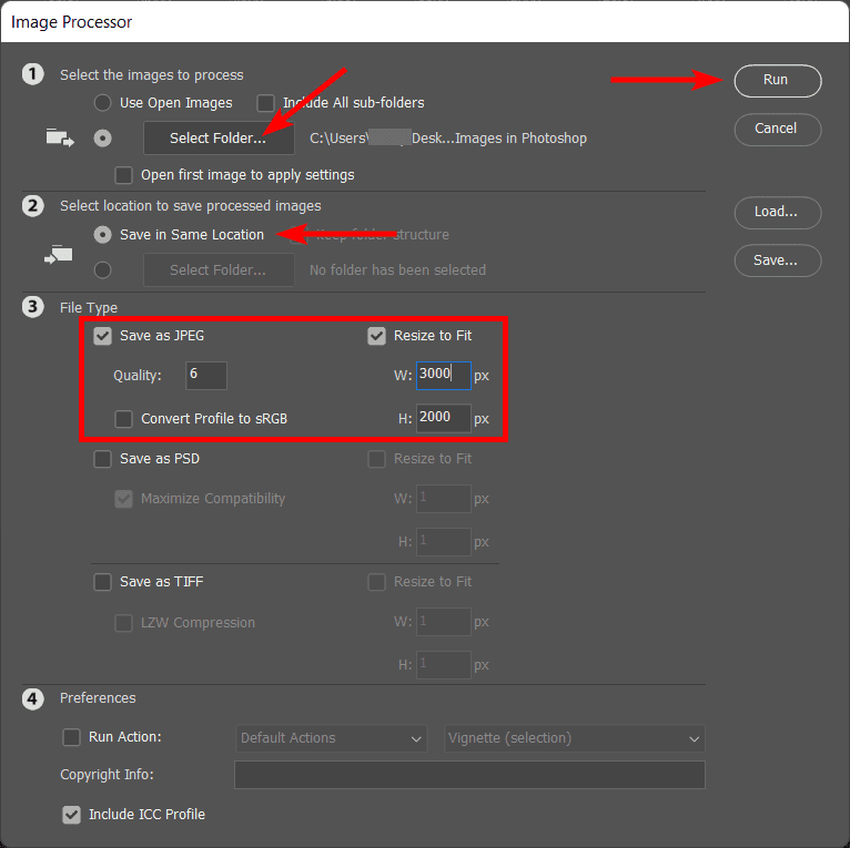 In the panel, choose the action you have just created under Action. Select the Source folder, which contains all the images you want to bulk resize, then click OK.