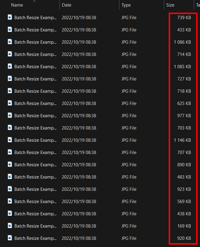 Photoshop will run through the various images, resizing them and saving them into the folder in which you saved the first image. You can see the smaller file sizes in the new folder.
