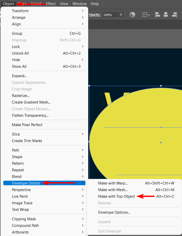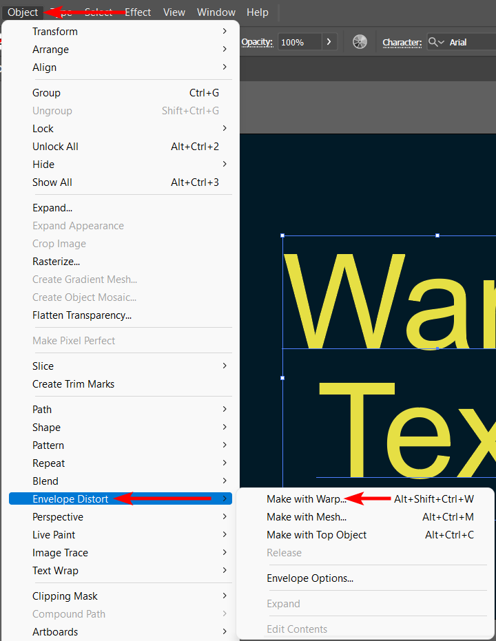 - Go to Object > Envelope Distort > Make with Warp or press Alt/Option + Shift + Ctrl/Cmd + W