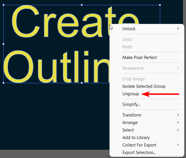Before you customize the text, I recommend ungrouping it so you can edit each letter individually. To ungroup the outlined text, ensure it’s selected, then right-click/Ctrl + click and select Ungroup. You can also press Shift + Ctrl/Cmd + G.