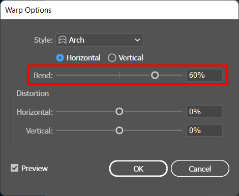Adjust the amount the text bends using the Bend slider or add an amount in the box.