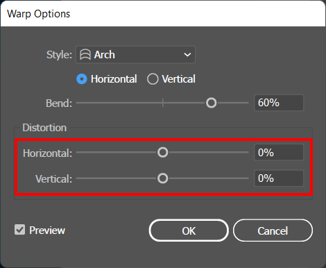 Change the Horizontal and Vertical distortion, which affects the perspective of the text, by adjusting the sliders.
