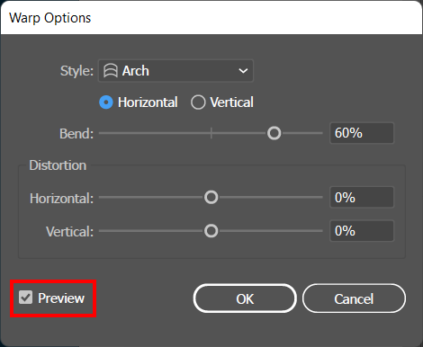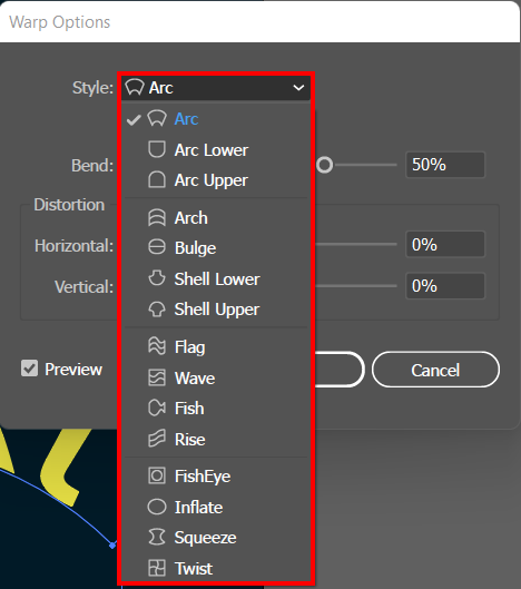 This action opens the Warp Options dialogue box. You can select a preset warp shape from the Style drop-down menu.
