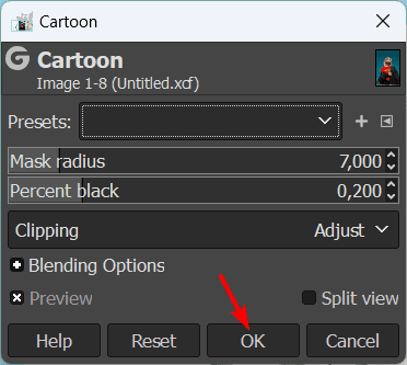 Select the merged layer, then go to Filters > Artistic > Cartoon (or choose the filter you want).