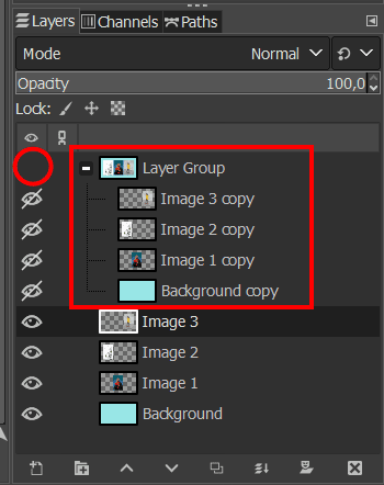 Then, drag each copied layer and drop it onto the group to move the layers into the group folder. Next, hide the group by clicking on the eye icon next to the layer. The eye will disappear, and all the contents in the group become hidden on the canvas.