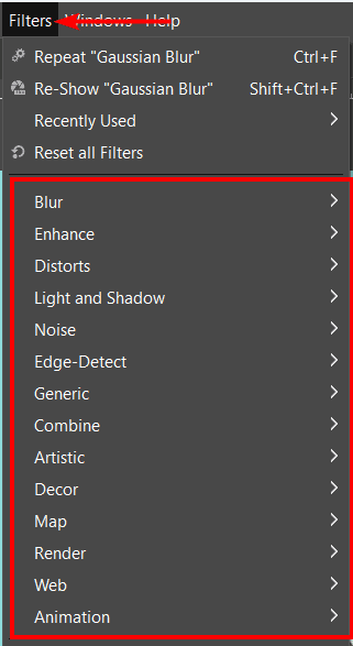 Once the layer is selected, you can add the filter by going to the Filters menu and selecting one of the filter groups.