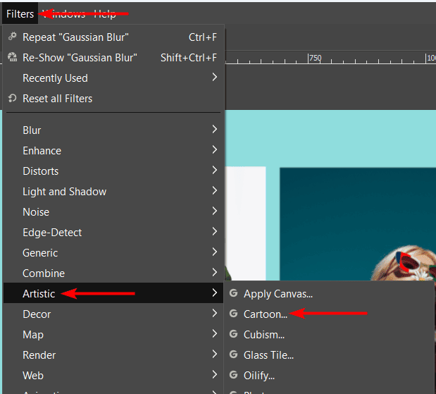 You can click on the arrow next to a filter group to look through the filters and select the one you want to use. Here, I will open the Artistic filter group and select the Cartoon filter.