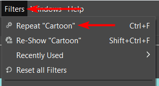 Once the new layer is selected, you can go to Filters > Repeat “Cartoon” (the filter you used will be shown here) or use the shortcut Control + F on Windows or Command + F on Mac.