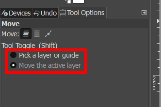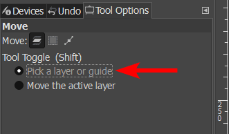You can also select whether to pick a layer or guide, which will select the layer of whichever pixels you click on on the canvas, or you can move the active layer, which moves the layer you selected in the Layers docker.