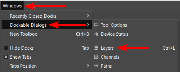 If you can’t see the Layers docker, go to Windows > Dockable Dialogs > Layers or use the shortcut Control + L on Windows or Command + L on Mac.