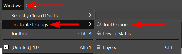 To fix this, find the Tool Options docker, usually below the Tools docker. If you don’t see the docker, go to Windows > Dockable Dialogs > Tool Options.