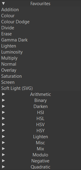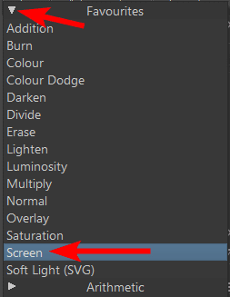 The Blending Modes are grouped into categories. I will select the Screen option under the Favorites tab for this example.