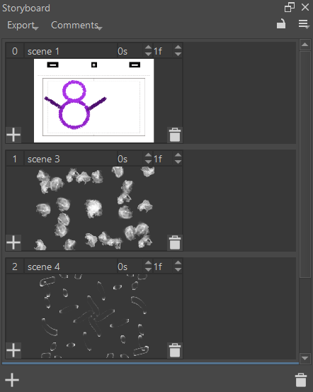 The storyboard docker helps keep track of your storyboards. You can organize the different parts of your animation using this docker by moving the artboards around, adding new artboards, or deleting artboards.