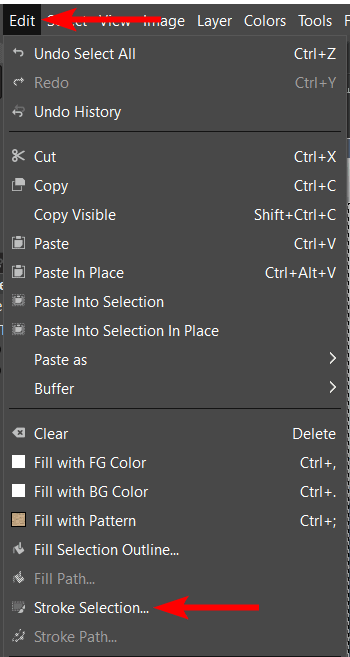 Then go to Edit > Stroke Selection. This tells GIMP only to apply the border around the selected layer since you created a selection around that layer.
