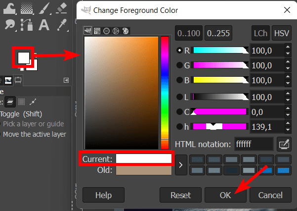 The Color Selection Window offers you multiple ways to change the color. You can use the color picker box, the slider containing all the hues, or add specific RGB values. Select the color you want and click OK.