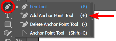 Select the Add Anchor Point Tool from the toolbar to use this method. The tool is usually hidden in the fly-out menu under the Pen Tool, so you need to click and hold on the Pen Tool to find it. You can also use the shortcut + (plus sign) on Windows and Mac to activate it.
