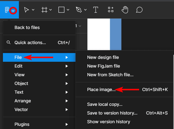 Alternatively, you can go to the Figma Main Menu, then go to File > Place Image, or use the keyboard shortcut Shift + Control + K on Windows or Shift + Command + K on Mac.