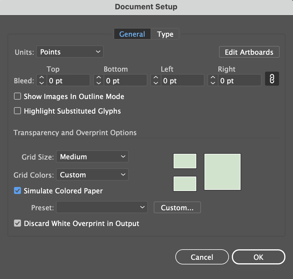 - From the Document Setup window, check "Simulate Colored Paper" and choose a new background color for the artboard using the top color swatch selector (you will see two stacked colors swatched under the "Transparency and Overprint Options" — you want the top one)