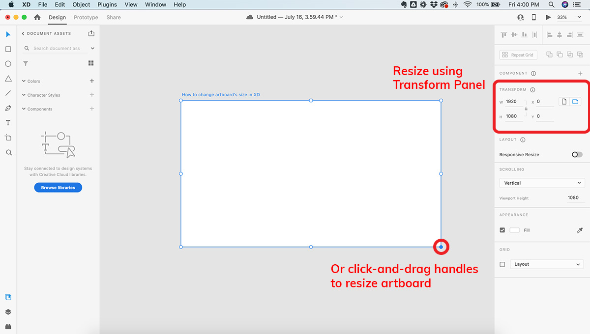 - Or, change the artboard's size to an exact measurement using the Transform panel on the right side — just enter your new height and width dimensions and you're done!