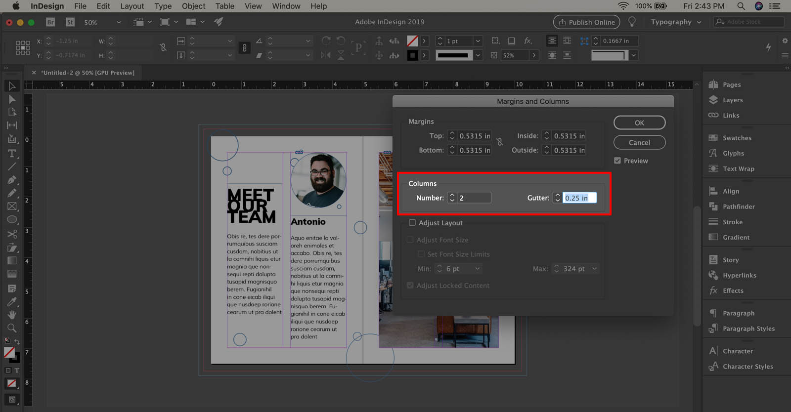 Columns are ideal for creating quick and accurate document layouts inside InDesign. By using multiple columns formats throughout your project you can quickly layout text, graphics and images like a pro!