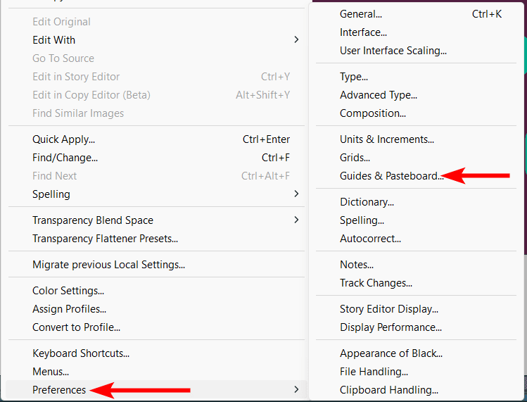 You can also use the shortcut Control + K on Windows or Command + K on Mac to open the preferences and select the Guides & Pasteboard tab.