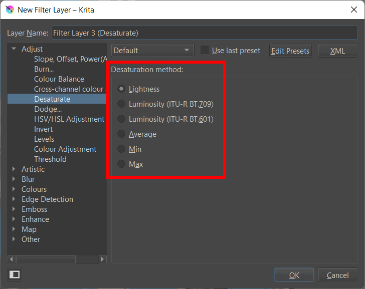 There are a few ways to make an image black and white in Krita, and the method you use depends on what you want to achieve. You can add a filter that only affects the image layer or a filter that affects all the layers below it that you can turn on and off. Here is how to do both methods.