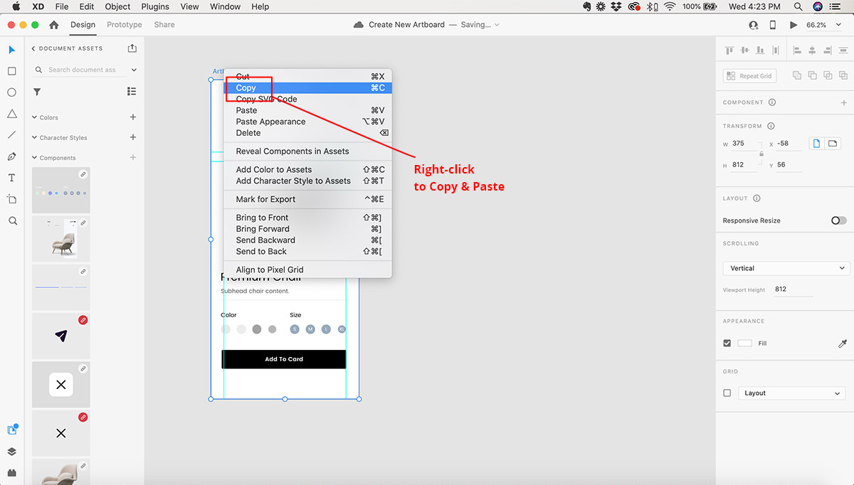 - Hovering over the artboard you want to duplicate, right-click and select “Copy“