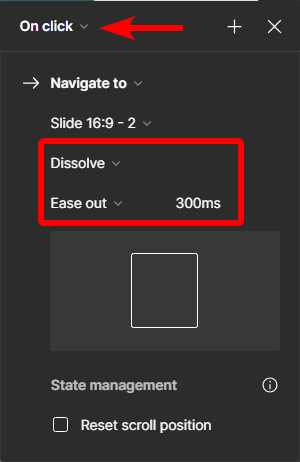 You can then go through the settings and adjust them as needed. You can choose whether the interaction needs a click or a mouse hover and set an animation for how the two frames transition.