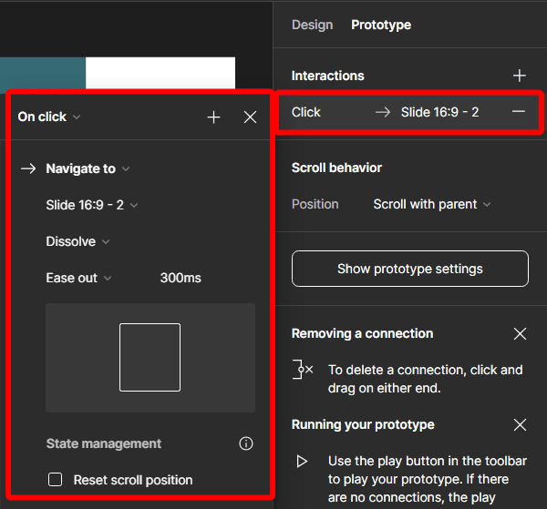 Next, you can add interactions to the connections. This determines what happens between the transition from the user clicking on the starting point and the new frame appearing.