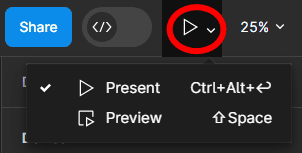 To present the prototype, click on the play button at the top of the right-hand panel. If you want to preview it, click on the arrow next to the icon and select Preview.