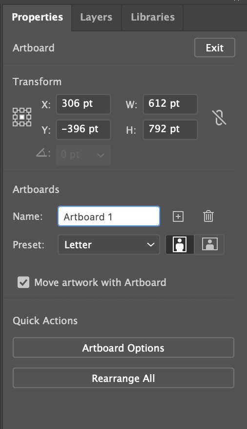 From this panel, you can easily change the size, name, and orientation of your Artboard.