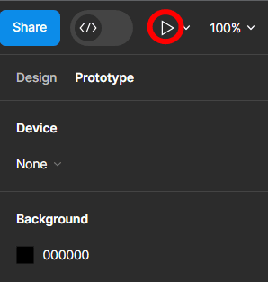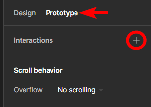 Once you have the default and adjusted design elements connected, you can add a new interaction to set how the first element should change and get to the new element. To add a new interaction, first, ensure the default state element is selected, then open the Prototype Tab in the right-hand panel.