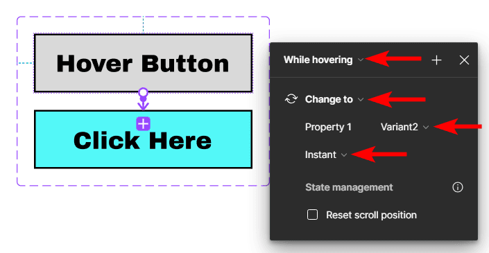 Underneath the Change To option, you should see your default element, which in my case, is Property 1. Change the second element to what you want the object to change to when hovering, which in my case, is Variant2.