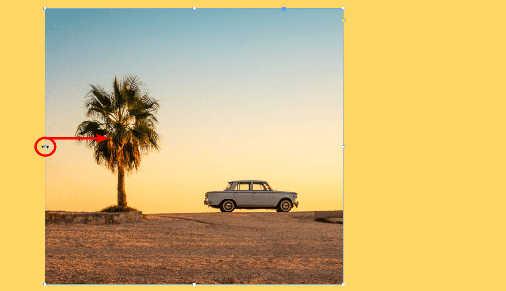 You can click on any control handle and drag it inward to crop the image. For example, I want to crop out the trees and turn the image into a portrait image. To do this, I click and drag the right handle inward and then do the same on the left handle.