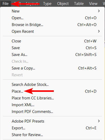 First, to add the image to the project, go to File > Place or use the shortcut Control + D on Windows or Command + D on Mac.