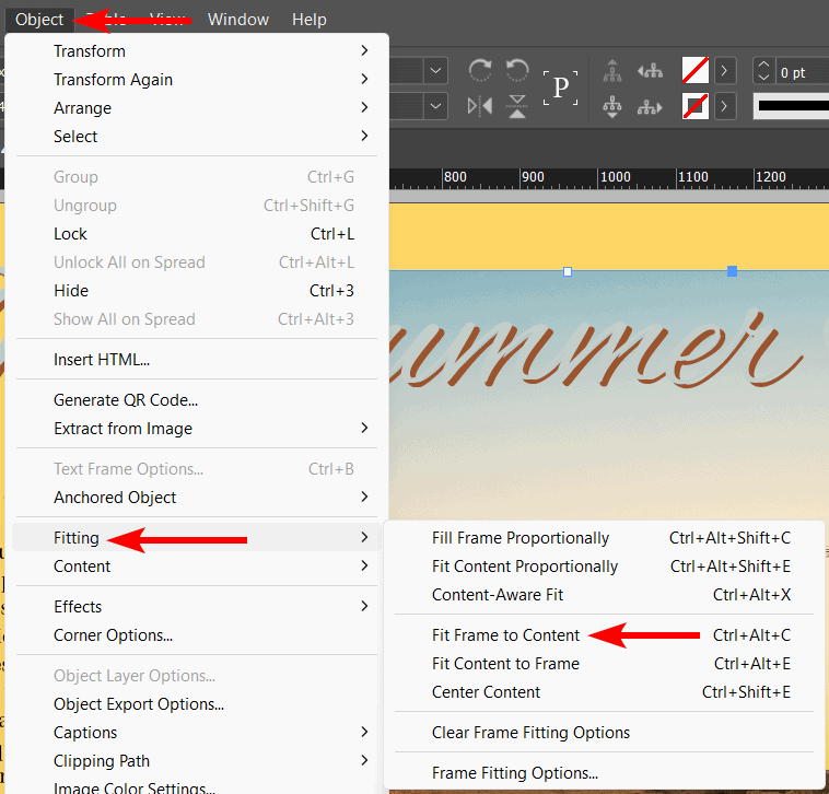 First, select the frame and then go to Object > Fitting > Fit Frame to Content. You can also use the shortcut Control + Alt + C on Windows or Command + Option + C on Mac.