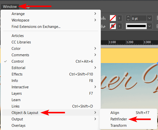 Then, open the Pathfinder panel. If you can’t see the panel, go to Window > Object & Layout > Pathfinder.