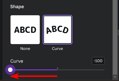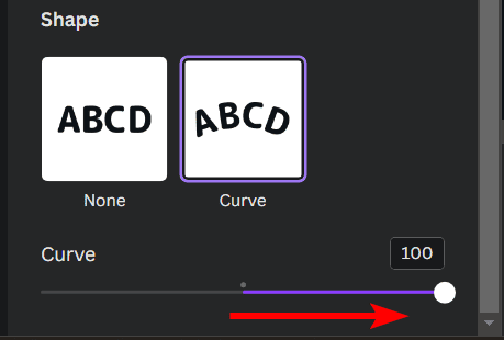 When the curve effect is activated, a Curve slider appears below the effect option. You can use this slider to change the curve’s direction. Move the slider to the right to curve the text down. The further right you move the slider, the more pronounced the curve will be.