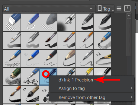 Right-click on Windows or Control + click on Mac to check the brush name in case you want to restore it later.