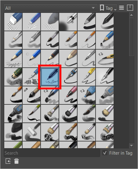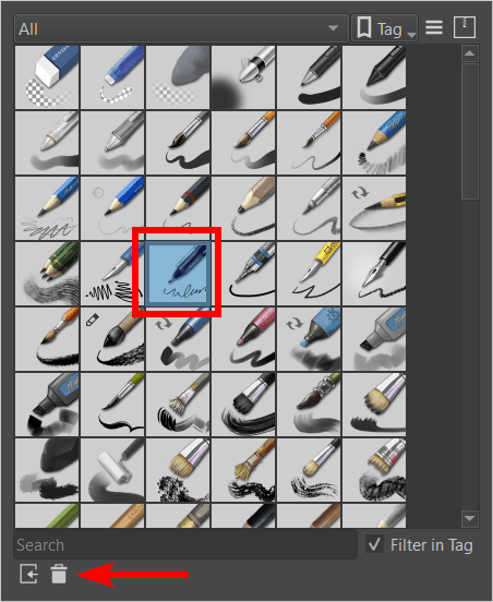 Click on the brush preset again to ensure you have selected the correct brush. Then, click on the Bin icon at the bottom left of the panel.