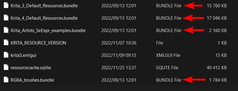 To locate the Krita default bundles, look for the files with a .bundle extension. These files are zip folders, so copy and save the file to your desktop and change the extension to .zip and you can find the brush presets inside these files.