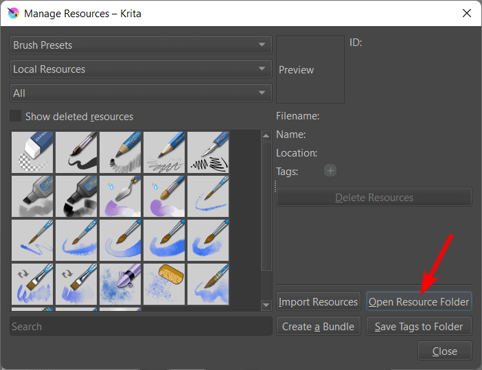 All the Krita default brushes and resources, as well as any resources you’ve created, are stored in the files on your computer. You can access these files at any stage through your file explorer or finder. You can also quickly jump to the resource folder from Krita.