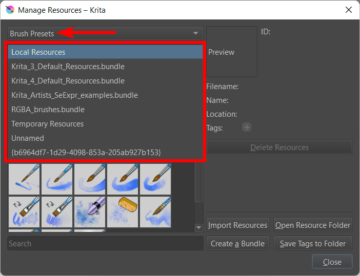 Then, use the dropdown menus to find the resource you deleted. Choose Brush Preset in the first menu. Then, you may need to scroll through a few options in the second drop-down to find where the brush preset is located.