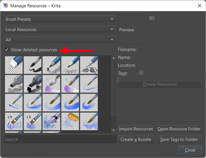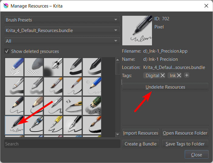 Look for the brush preset you deleted in the preview window and select it. Then, click on Undelete Resources on the right-hand side. You can repeat this process for any resources you want to restore.
