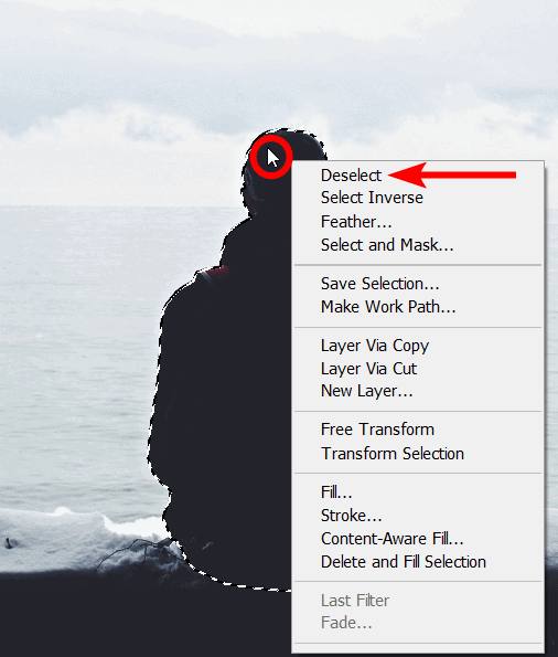 There are a few ways to deselect in Photoshop, but the quickest is the shortcut to deselect a selection, which is Control + D on Windows and Command + D on Mac.