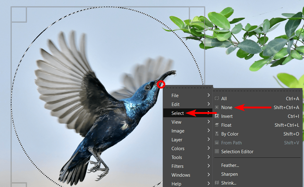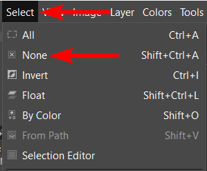There are four main ways to deselect a selection in GIMP, and the method you use depends on your workflow and preferences, as they are all quick and effective. These methods work for all of the selection tools.