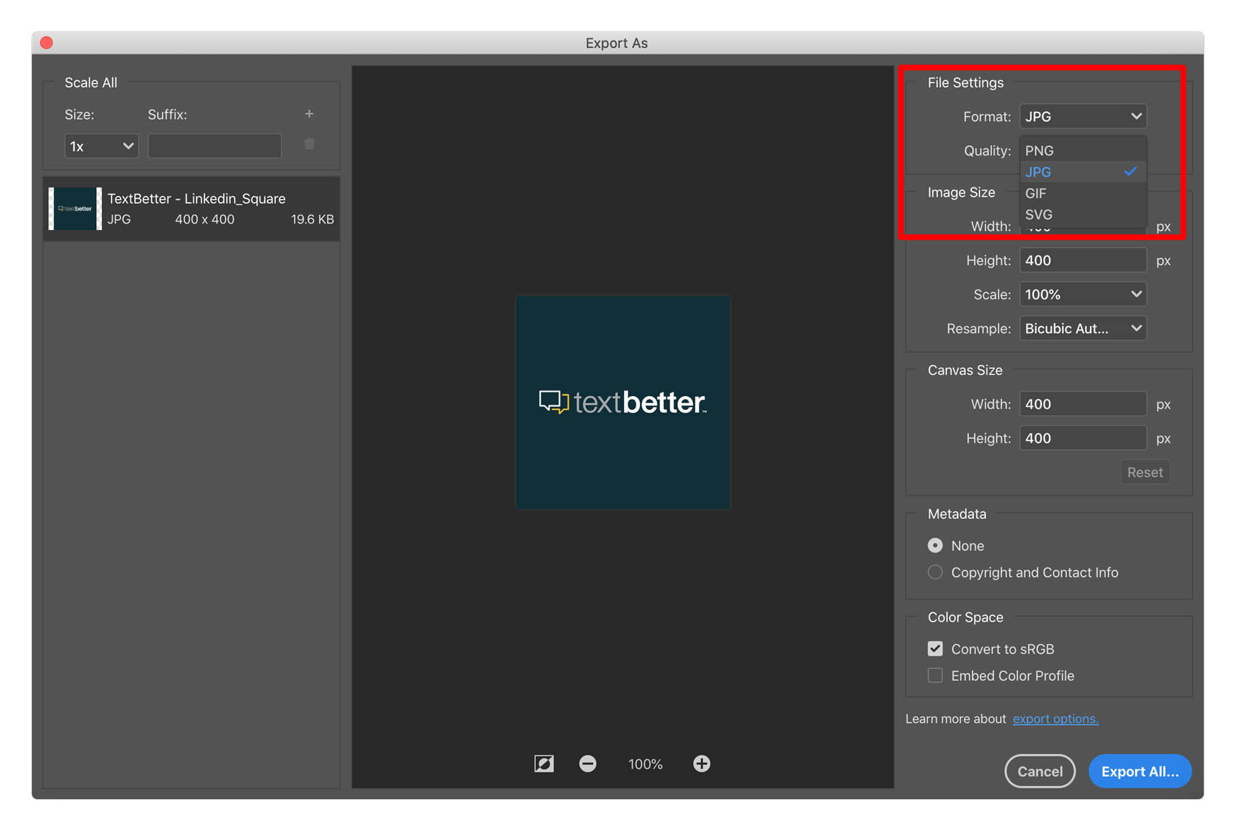 - From the Export As popup window, choose the JPG file format from the File Settings section and specify the Image Size that you want to export it as