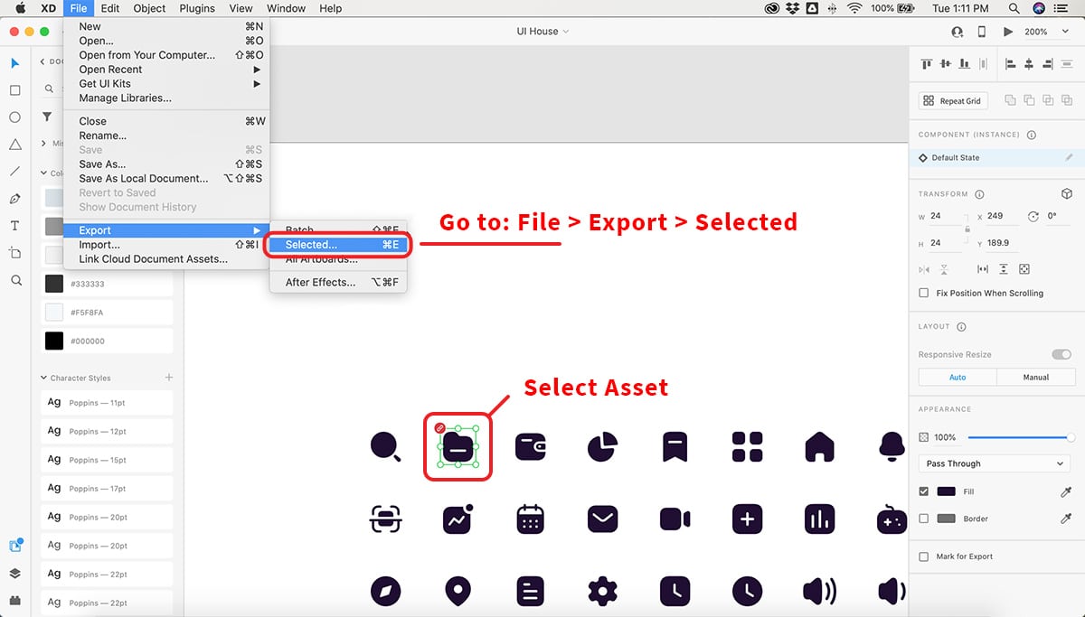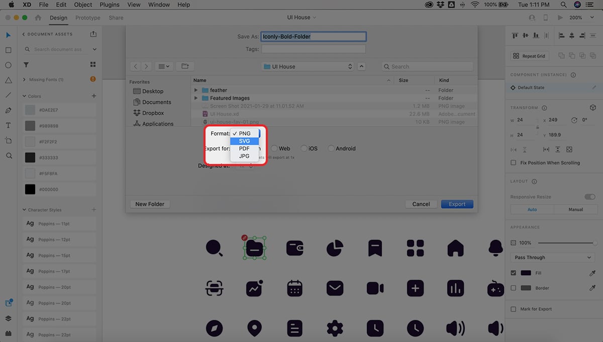 Assets like icons can easily be exported as a separate PNG, JPG, PDF or SVG file right from XD.